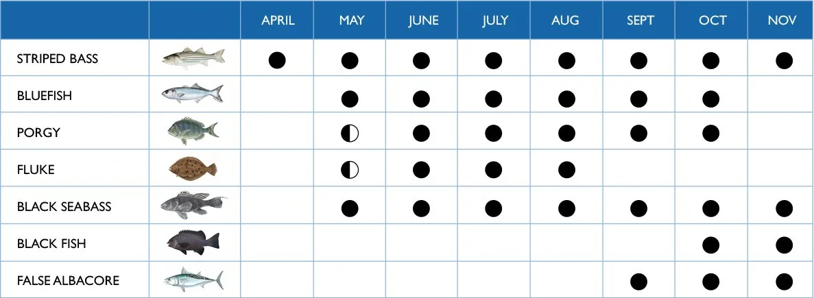 All day trips allow for the catch of multiple species including striped bass, bluefish, blackfish, sea bass, porgy, and false albacore. Additional fishing time allows for fishing in areas with less fishing pressure.